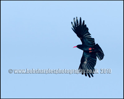 The distinctive orange feet and beak of the Chough show well in this flight shot